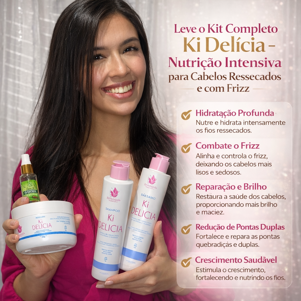 O Kit Que Delícia – Nutrição Intensiva para Cabelos Ressecados e com Frizz foi desenvolvido para devolver maciez, brilho e alinhamento aos fios que sofrem com ressecamento, aspereza e aspecto opaco.